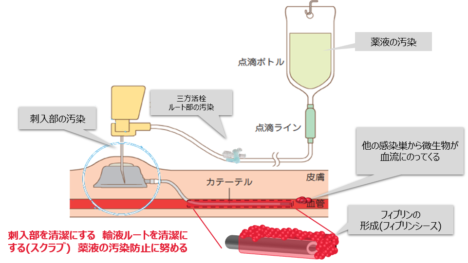 ※CRBSI (catheter related blood stream infection)カテーテル由来血流感染とは、血管内に留置されているカテーテルに細菌が定着・増殖し感染に至ったもの