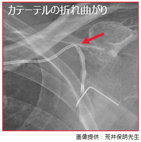 2.日常の活動や運動。立位や上司の挙上により、内頚静脈や他の静脈への移動も起こりうる。カテーテル交換をおこなったり、別の部位への造設も検討する