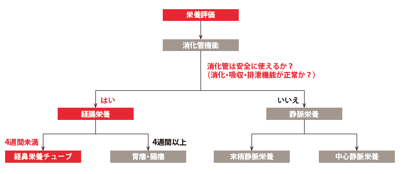 消化・吸収・排泄機能が正常であれば経腸栄養が選択され、正常でない場合は静脈栄養が選択されます。