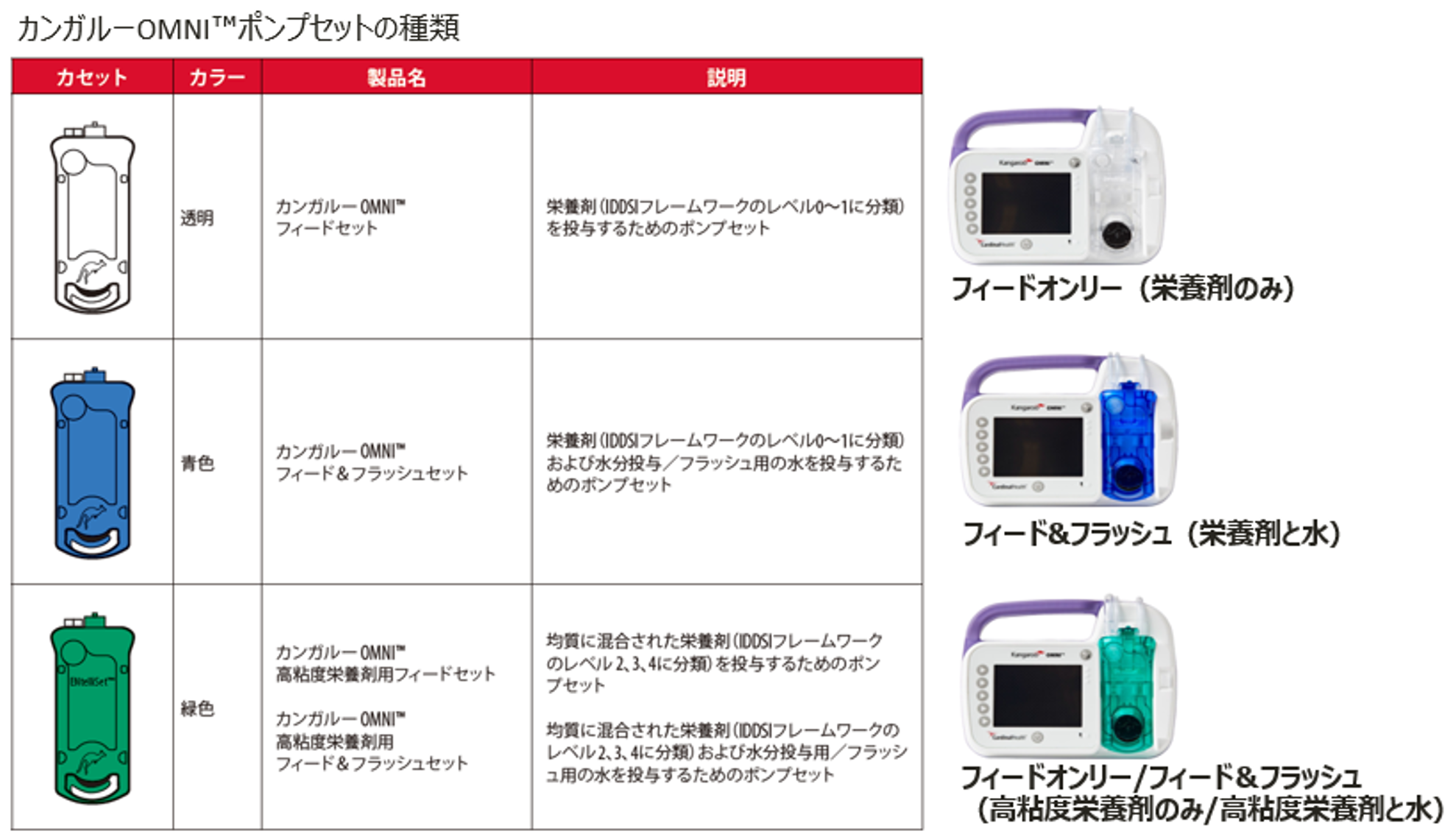 カンガルーOMNIポンプのポンプセットの種類を教えてください。