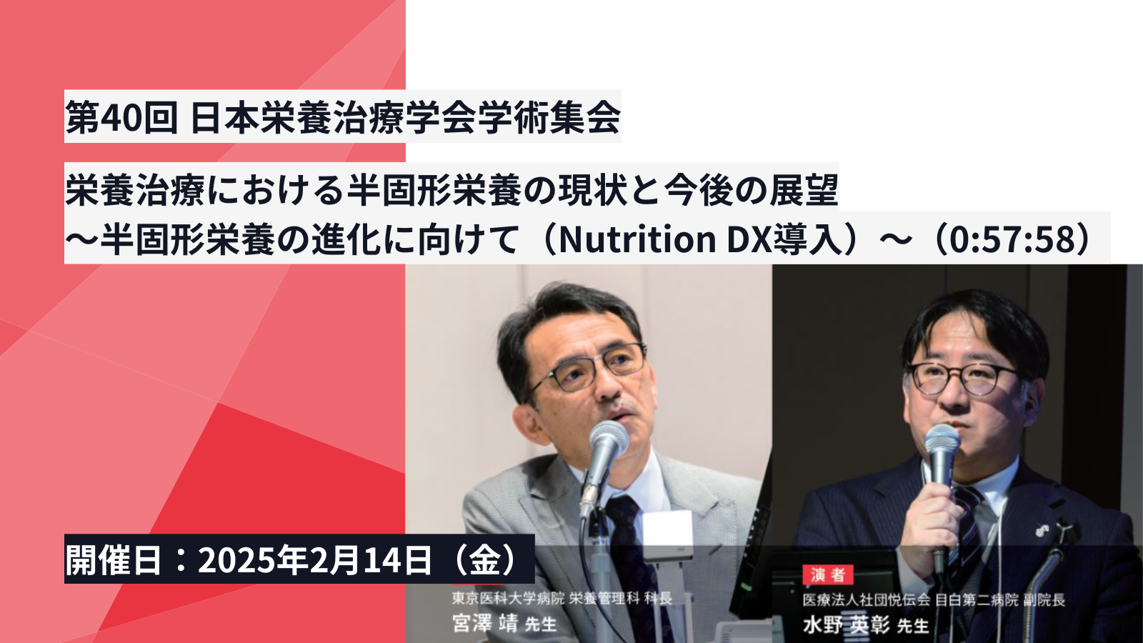 ~半固形栄養の進化に向けて(Nutrition DX導入)~(0:57:58)座長:宮澤 靖 先生(東京医科大学病院 栄養管理科 科長)演者:水野 英彰 先生…