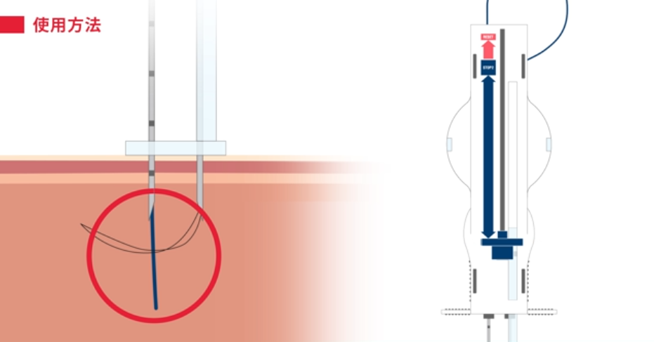 - STOP2の位置でレバーを把持し、ループが結紮糸を確実に把持していることを確認しながら、本製品を静かに体外へ抜去し、結紮糸を体外へ誘導します。