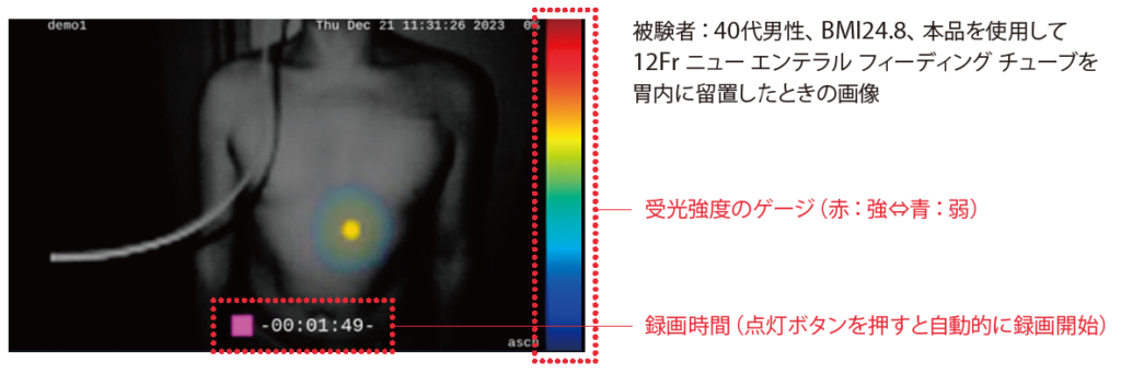 - 経鼻栄養チューブ挿入の際、位置確認と同時にモニター動画を記録し、任意のタイミングで静止画を記録として残せます。