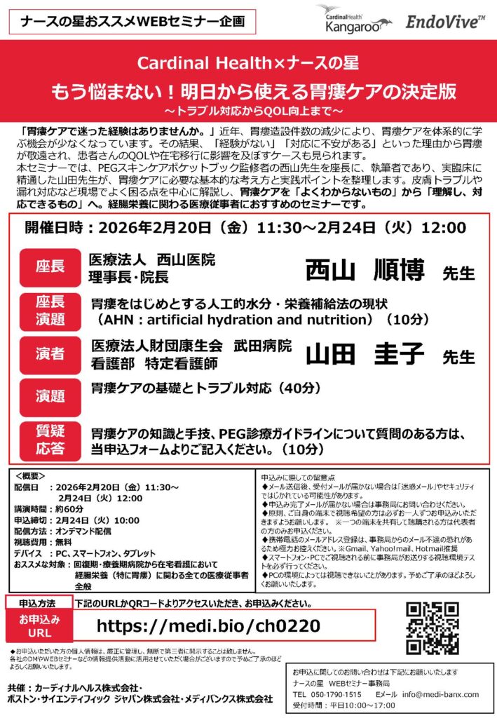 皮膚トラブルや漏れ対応など現場でよく困る点を中心に解説し、胃瘻ケアを「よくわからないもの」から「理解し、対応できるもの」へ。経腸栄養に関わる医療従事者におすすめのセミナーです。